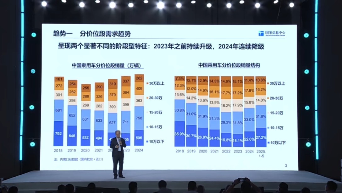 他还指出,国内乘用车价位段需求呈现两个显著不同的阶段型特征,即2023年前乘用车消费持续升级,2024年连续降级。其中,10万元以下的车型占比从2024年的22%,提升至今年前5个月的27.2%。