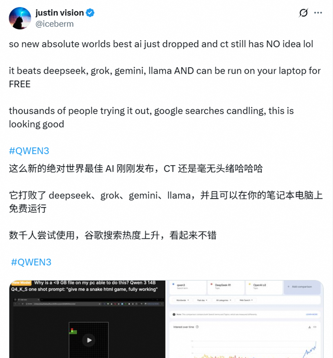 4月初宣布对中国征收高关税,以为中国会主动求饶,没想到我们早就看穿了对面是个绣花枕头,果不其然,美国先扛不住了。美国的鸡蛋价格飙升,零售行业更是陷入混乱中,超市抢购一空,人人自危。逼得零售商没办法了,开始主动恢复从中国供应链进货,并表示这关税由美国方面承担。实际上配查信,很多人不知道的是配查信,美国除了对中国的制造业制裁失败之外配查信,在科技方面也是连吃败仗。4月25日,美国网络与信息技术研究与发展(NITRD)公开了美国各界就「AI行动计划」提交的全部书面意见。其中最亮的,莫过于OpenAI和Anthropic了。这两家公司的措辞一致的强硬——必须对中国加强技术封锁!具体来说,就是必须限制高端GPU芯片和模型权重流向中国,而且美国AI必须在和中国的竞争中取胜。没想到言犹在耳,中国大模型反手就给了一巴掌。29日凌晨,阿里巴巴开源新一代通义千问模型千问3,打败了美国的Llama,一举拿下全球最强开源大模型的称号。简单来说,千问3表现出来的能力对美国的AI公司而言,简直是“我不是针对谁,我是说在座的各位都是辣鸡”的现实版!千问3之所以这么牛,总结起来就是能力强、成本低,这一点从国外开发者对它的评论也能看出来。比如说有外国的开发者就表示,千问3处理速度比Llama4,而服务器费用却大降。要知道当时美国的Meta发布了Llama4的时候,吹的天下无敌,可千问3却轻松超越,谁强谁弱,谁有真本事一看便知。阿里已经把200多个模型给开源了,全球下载量超过了3亿次,性能牛,使用成本低,给谁谁能不爱?反观美国那边的开源大模型,牛皮吹的震天响,一看实际的能力根本不是一回事,还谈什么封锁中国科技,干掉中国AI?就按照这个趋势下去,谁干掉谁可不一定。很显然,不管是在制造业领域,还是科技领域,美国都无法限制中国的发展,并且花费了很多功夫搞我们,但回头一看,中国没啥事儿,自己倒先挺不住了。